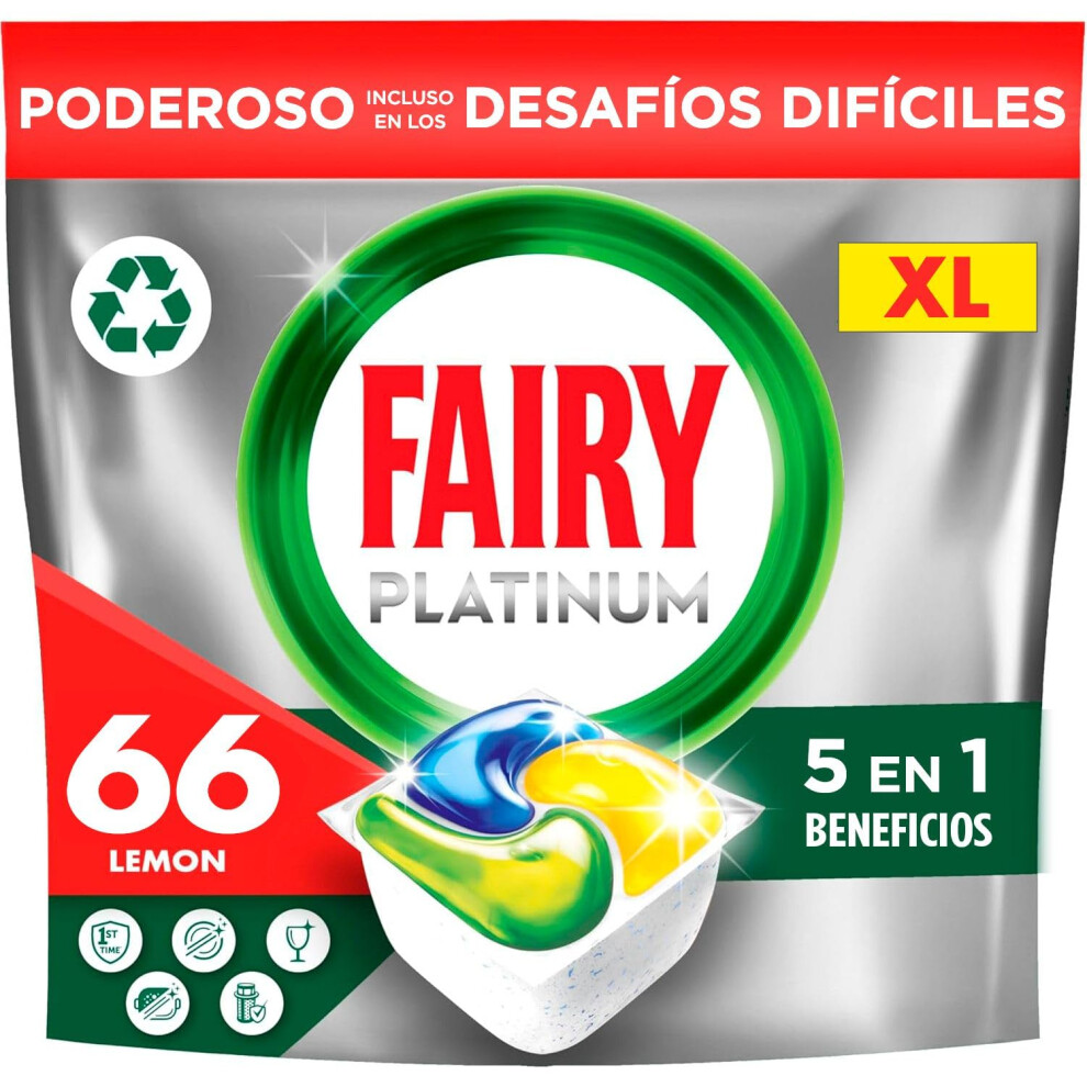 Fairy Platinum Complete 66 Lemon Dishwasher Tablets - 1st-Time Clean, Tackles Tough Dried-On Grease, Built-In Salt & Rinse Aid, Keeps Dishwasher Fresh