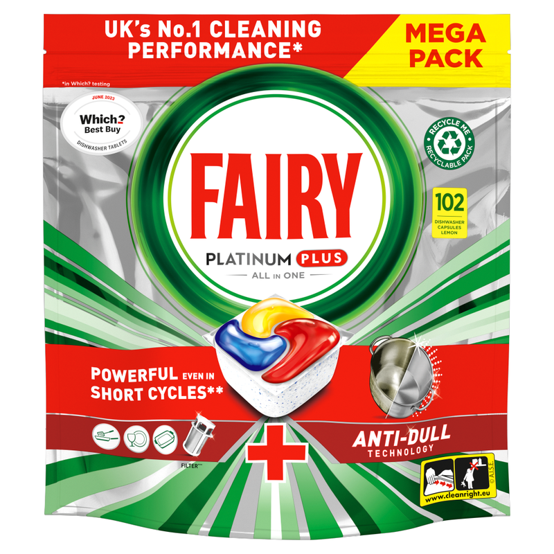 Fairy Platinum Plus All In One Dishwasher Tablets, Lemon, 102 Capsules
