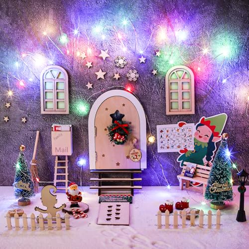 BOLWEO Fairy Door, Wooden Fairy Doors for Garden, 56Pcs Gnome Door Accessories with 2pc Fairy Light Mini Gnome Door Complete Set for Christmas Decoration Gnome House