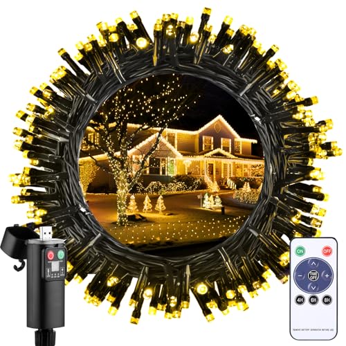Outdoor Christmas Tree Lights - USB Rechargeable Battery Operated - 15M 150 LEDs Warm White Fairy Light with Remote, Waterproof Indoor Outside Xmas Lights for Garden Party Camping Bedroom Decorations