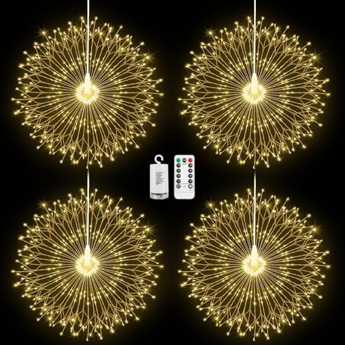Lewondr Christmas Firework Lights, 4 Pack Hanging Fairy Light with Remote, 210 LED Lights, 8 Modes, Waterproof Firework Starburst String Light for Outdoor Indoor Home Decor, Warm White