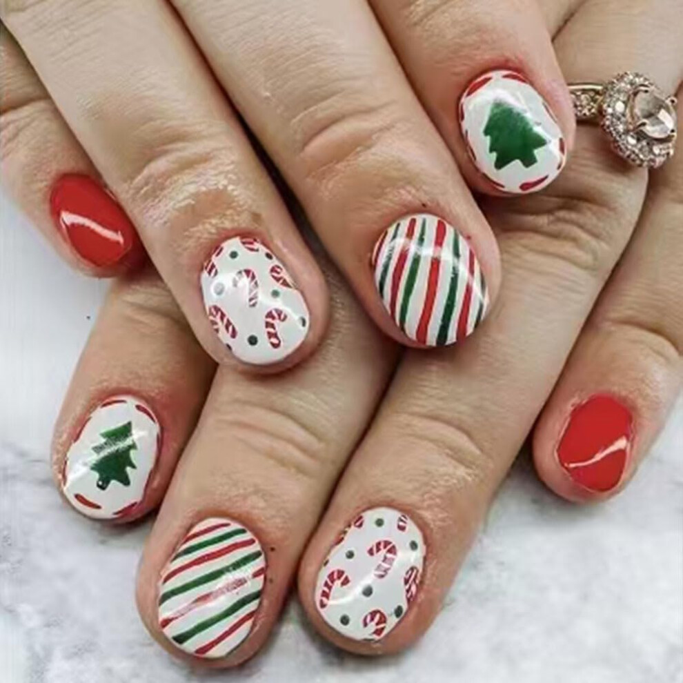 Christmas Press On Nails Short Almond Fake Nails with Christmas Tree Design Red and White Tips 24PCS