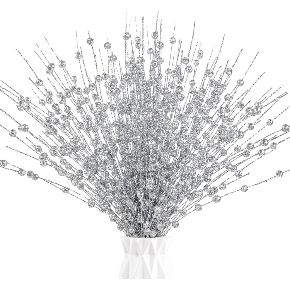 10 Pack Artificial Glitter Berry Stem Ornaments, 20" Fake Christmas Picks for Tree, Wreath, Crafts, Fireplace, Holiday Decor (Silver)