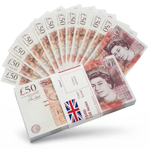 BIG SCREEN STACKS | PROP MONEY | 100 x £50 UK POUND NOTES | Extra Bank Strap Included - Fake Money for Movies, TV, Pretend Play and learning.