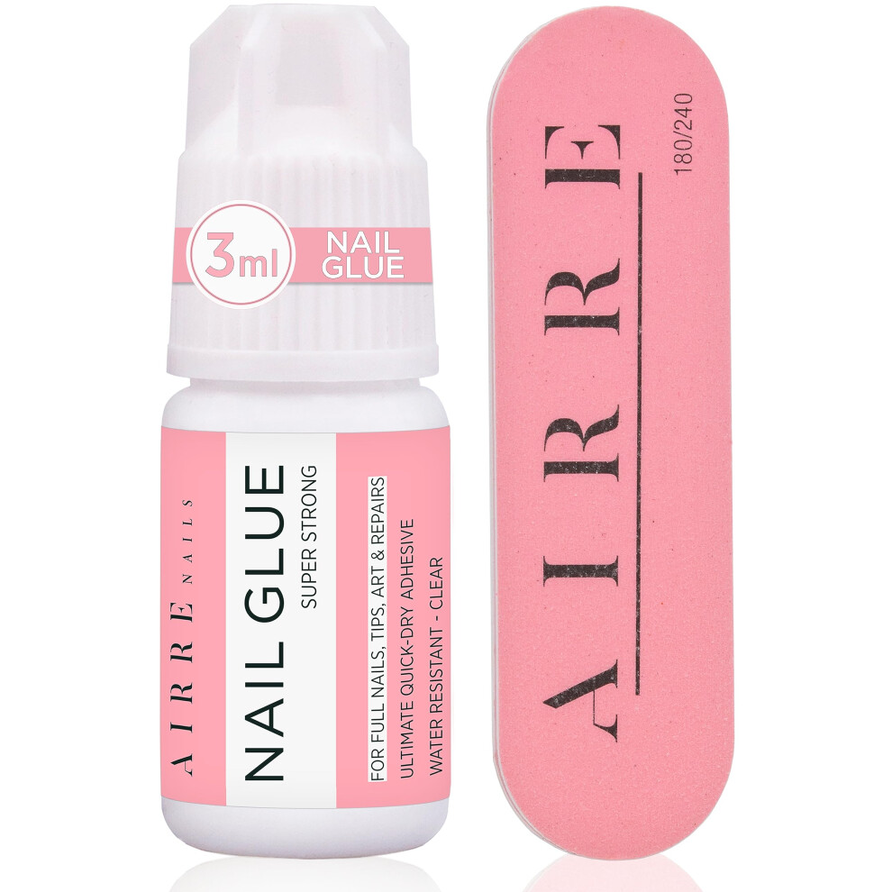 Extra Strong Nail Glue for Acrylic Nails Nail Tips & Press-On Nails (3ml) AIRRE Precision Tip Nail Glue & File for Glue-On Fake Nails Fix Broken Na