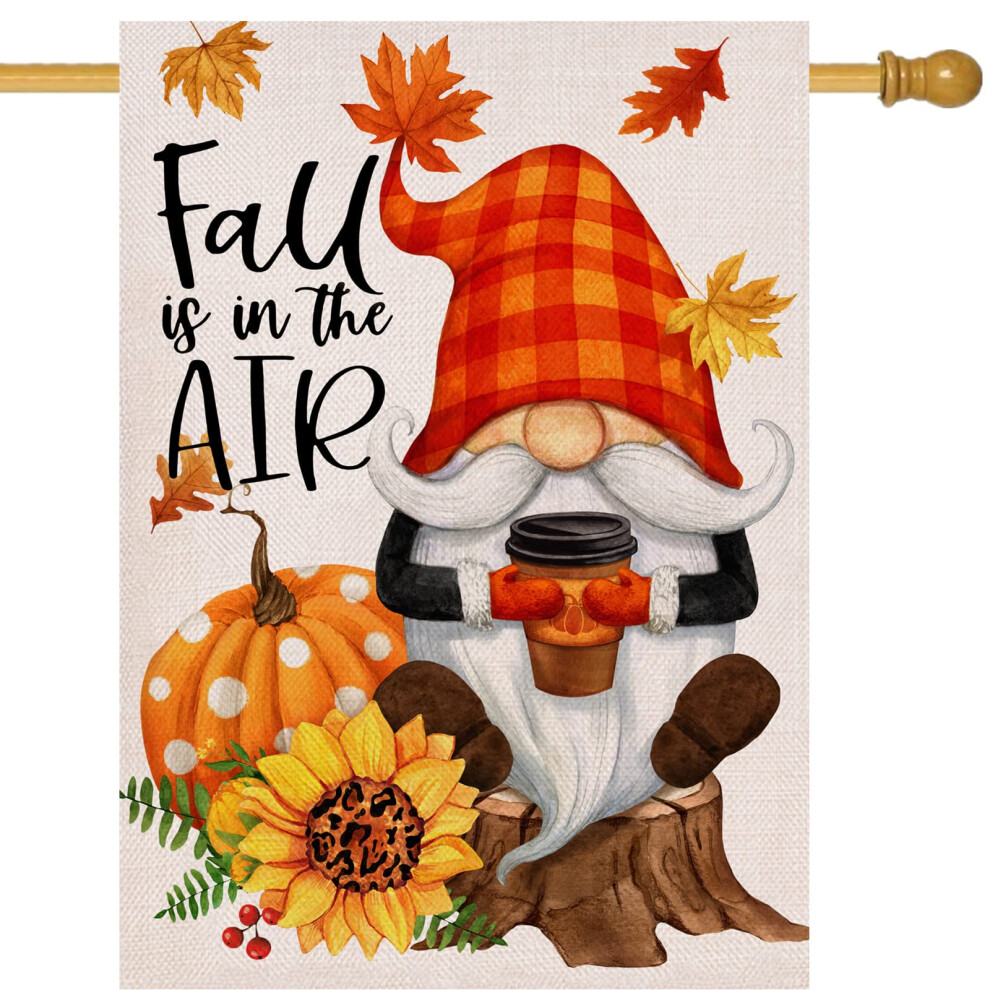 Fall is in the Air Gnome Pumpkin Coffee Decorative House Flag, Autumn Maple Leaves Decor
