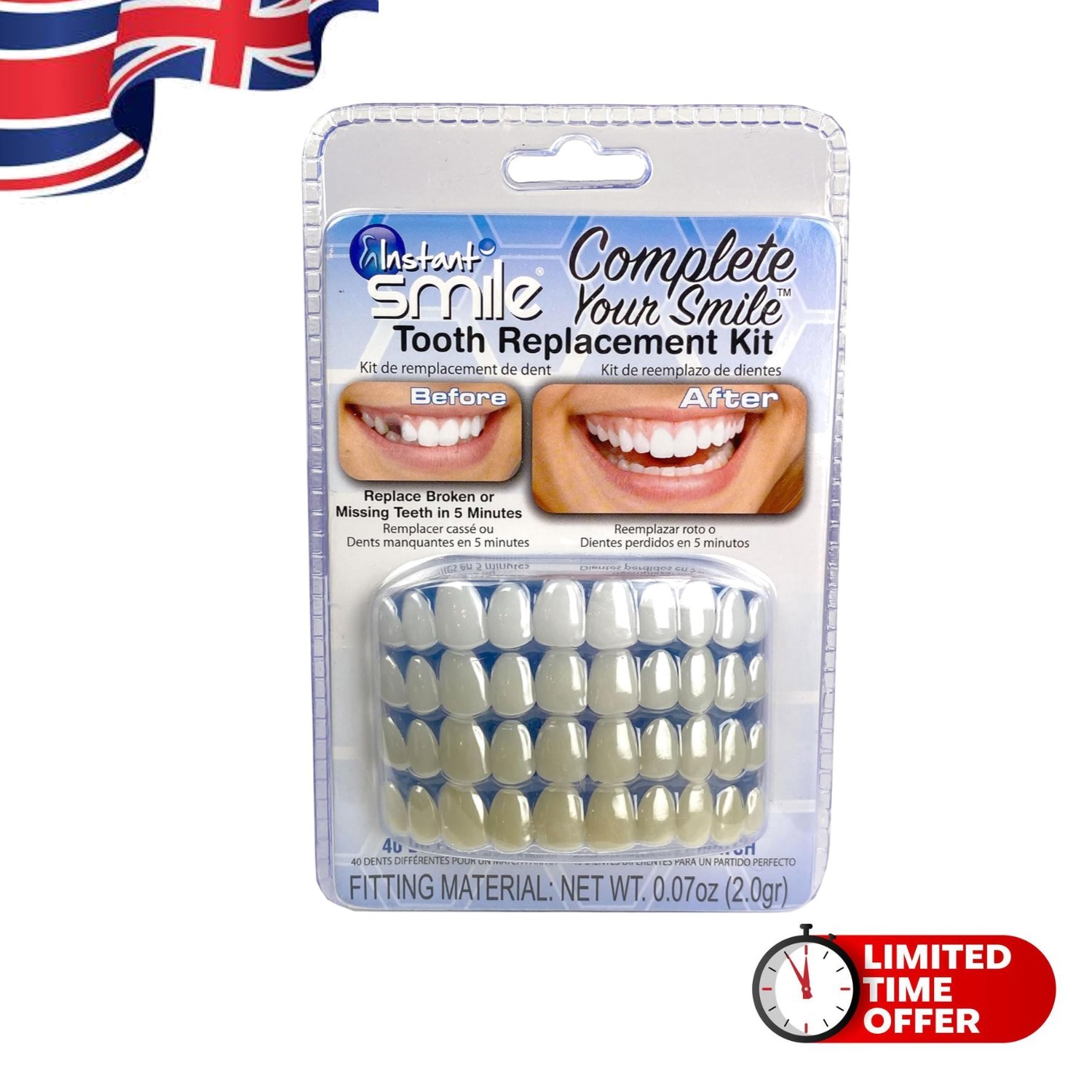 Instant Smile Complete Your Smile Temporary Tooth Replacement Kit, Broken or Missing Tooth Repair Kit, Bright White Natural and Dark Shades, Patented, 40 False Teeth