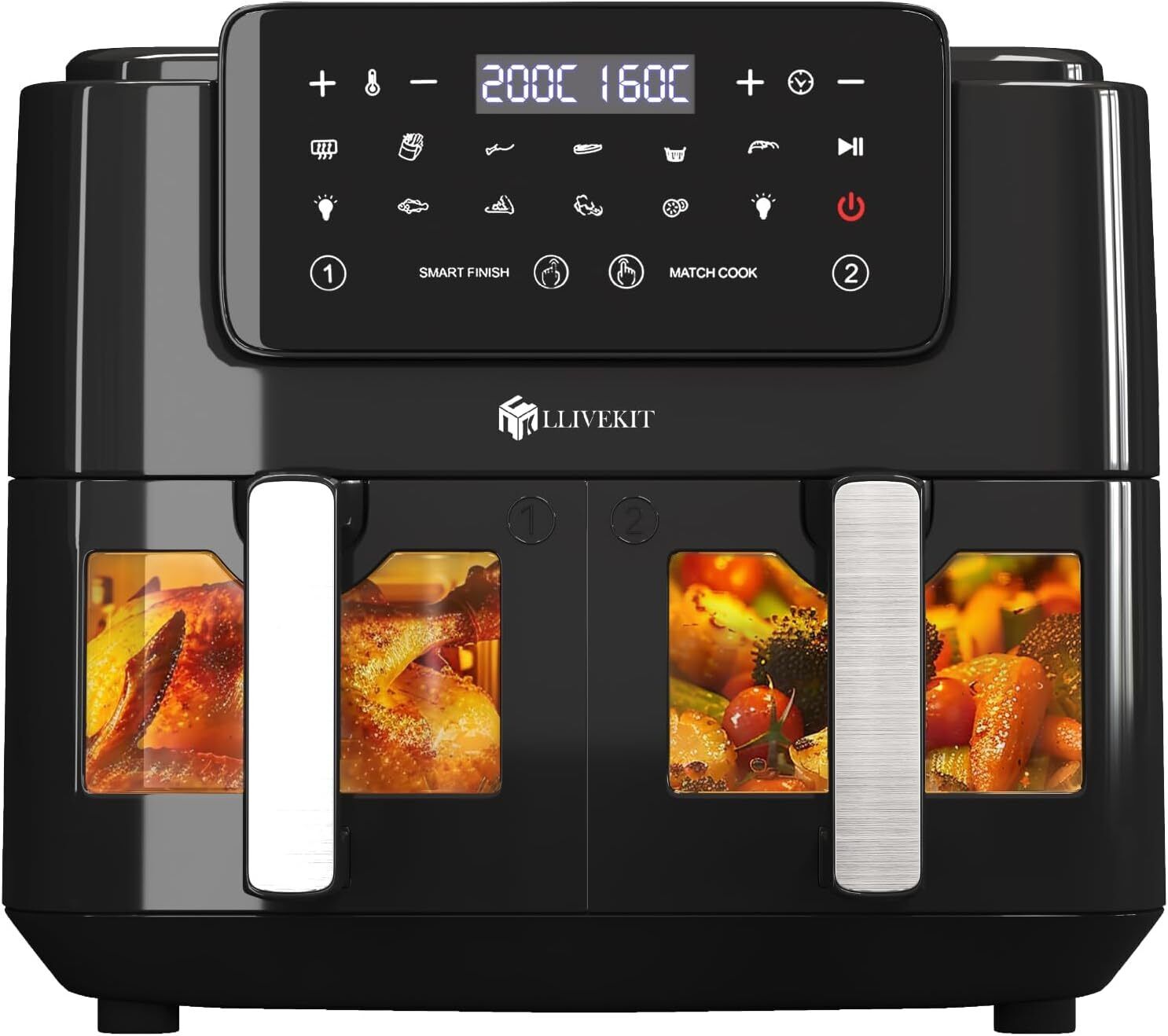 LLIVEKIT Dual Zone Oil Free Air Fryer 9L Large for Family with 2 Drawers, 10 &