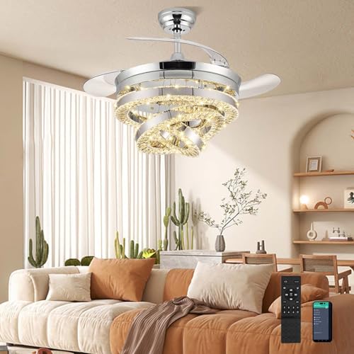 RHEAFON 42 Inch Dimmable Fandelier Crystal Ceiling Fan with Light Chandelier Ceiling Fan with APP& Remote Super Quiet 3 Color Change Timer Reversible Retractable Ceiling Fan for Bedroom Living Room
