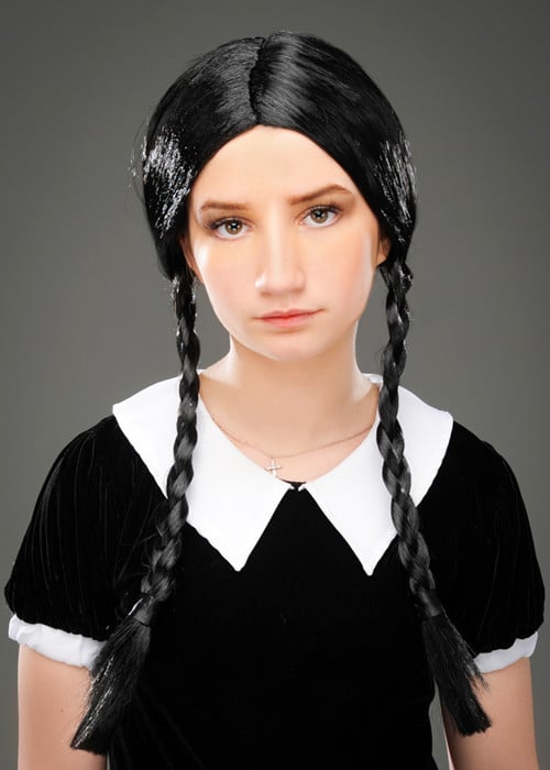 Kids Wednesday Addams Style Black Plaited Wig Gothic Girls Fancy Dress Pigtails