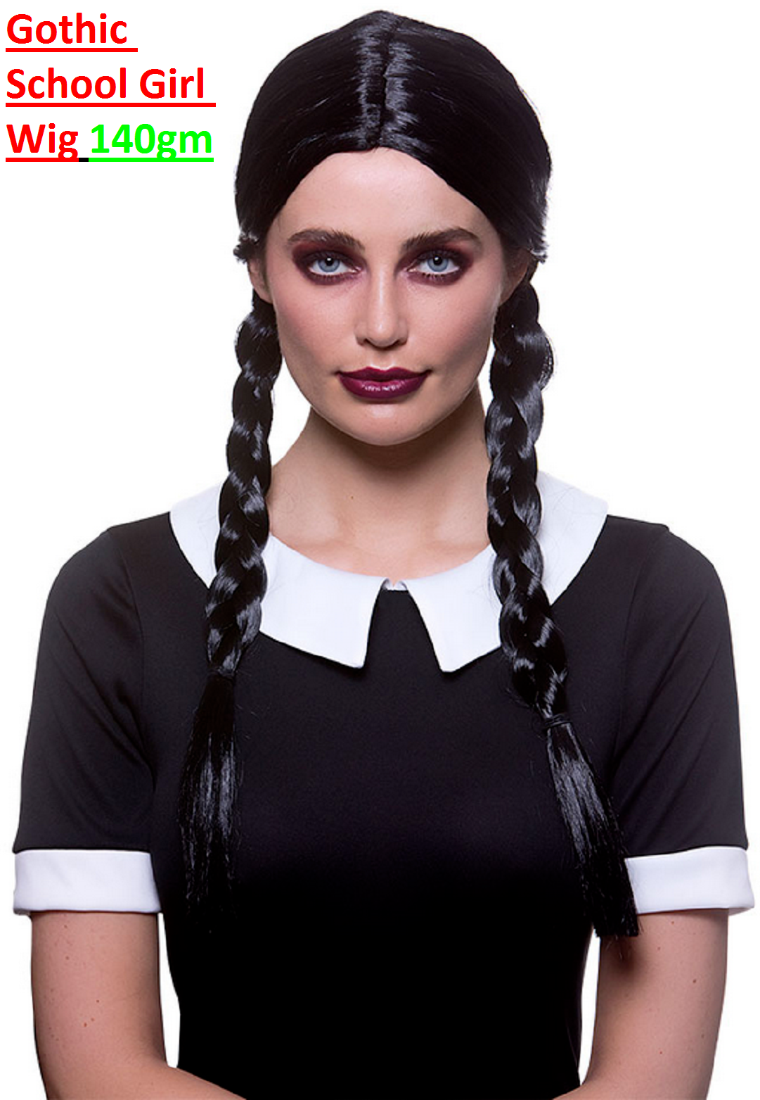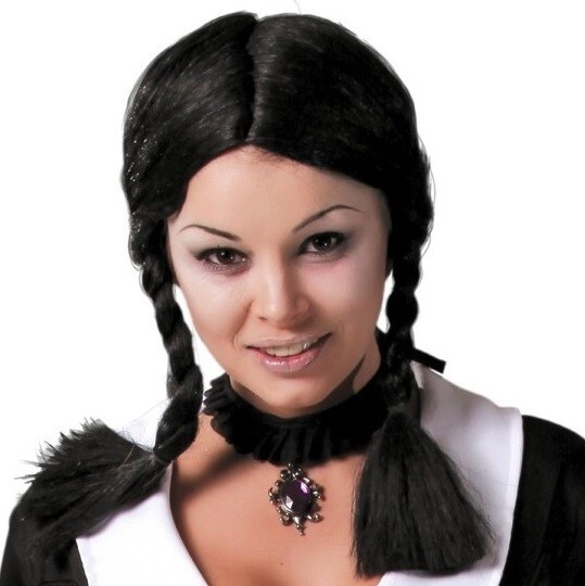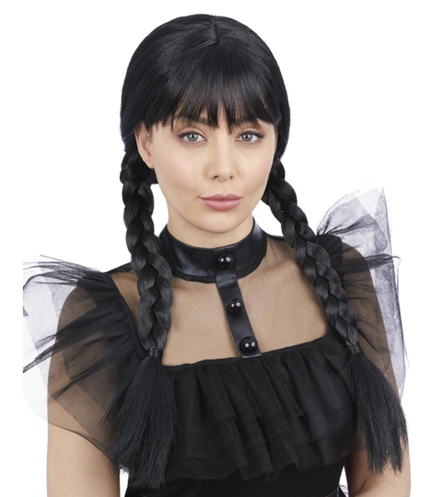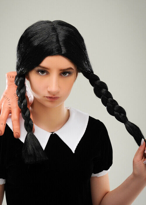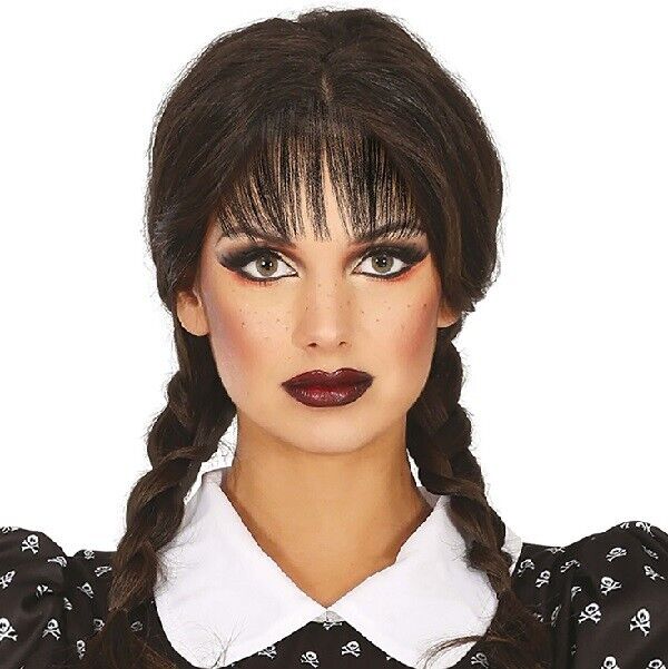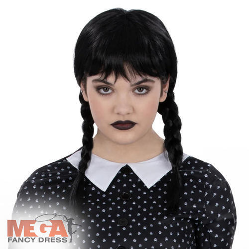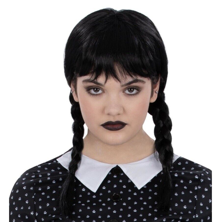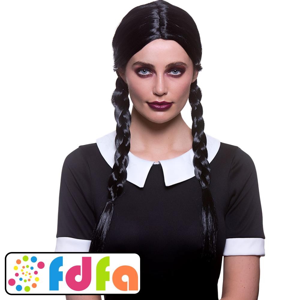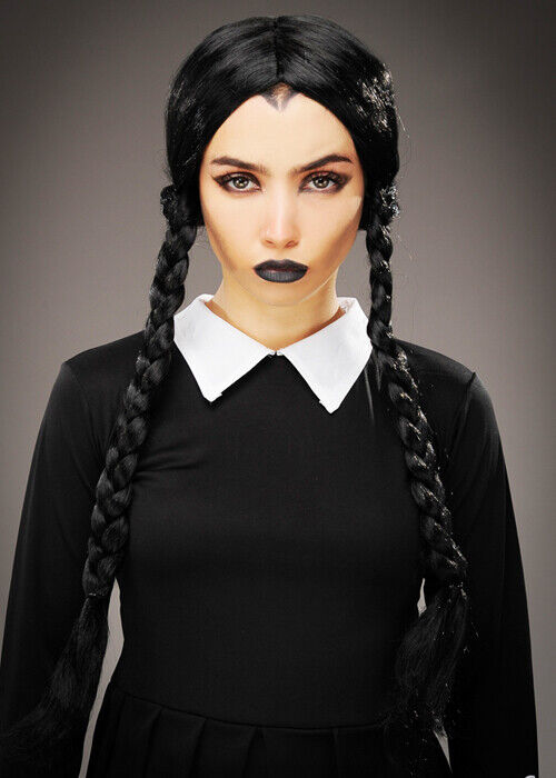 Wicked Creepy School Girl Wednesday Addams Wig Ladies Adults Fancy Dress