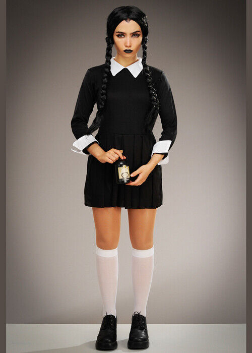The Dragons Den Adults Scary Daughter Wednesday Adams Halloween Movie Family Fancy Dress Costume [S-M]