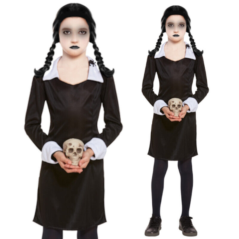 Girls Wednesday Addams Dress Costume Halloween Creepy Spooky Fancy Dress Party