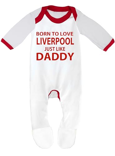 Cheekytots Born To Love Liverpool Just Like Daddy' - Soft 100% Combed Cotton Football-Themed Baby Sleepsuit for Football Fans (UK, Age, 3 Months, 6 Months, White/Red Trim)