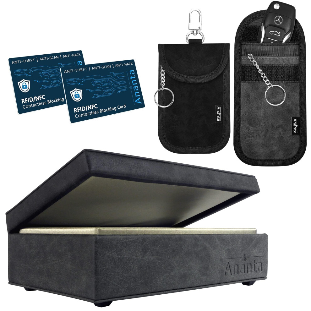 Ananta Faraday Box for Car Keys Plus 2 Faraday Pouches & 2 RFID/NFC Contactless Blocking Cards. Best for Keyless Car Signal Blocker Security (Black)