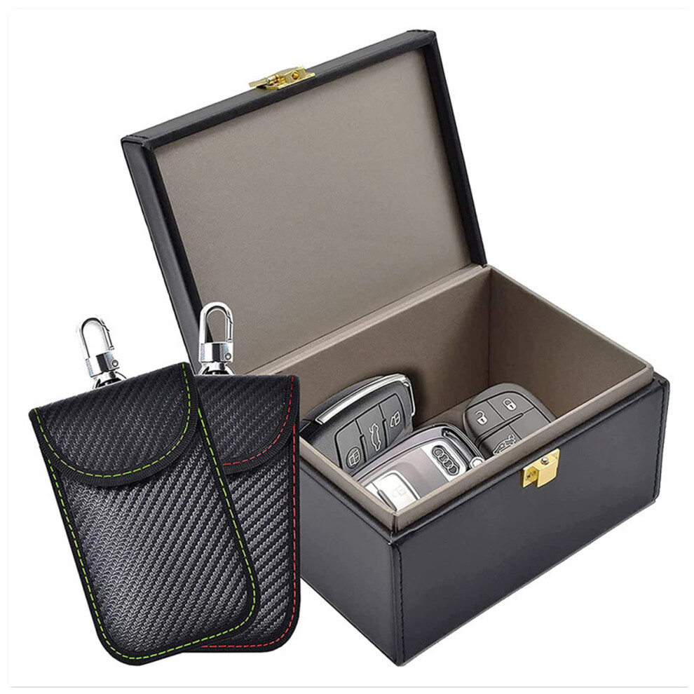 QIAOIDEA Faraday Box with 2 Carbon Fiber Key Pouches – RFID Signal Blocking Box for Car Keys & Phones, Anti-Theft PU Leather Case for Digital Privacy Protection – Key Fob Signal Blocker Set