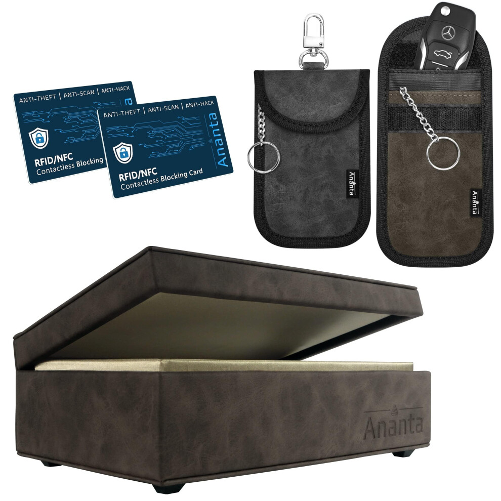 Ananta Faraday Box for Car Keys Plus 2 Faraday Pouches & 2 RFID/NFC Contactless Blocking Cards. Best for Keyless Car Signal Blocker Security (Brown)