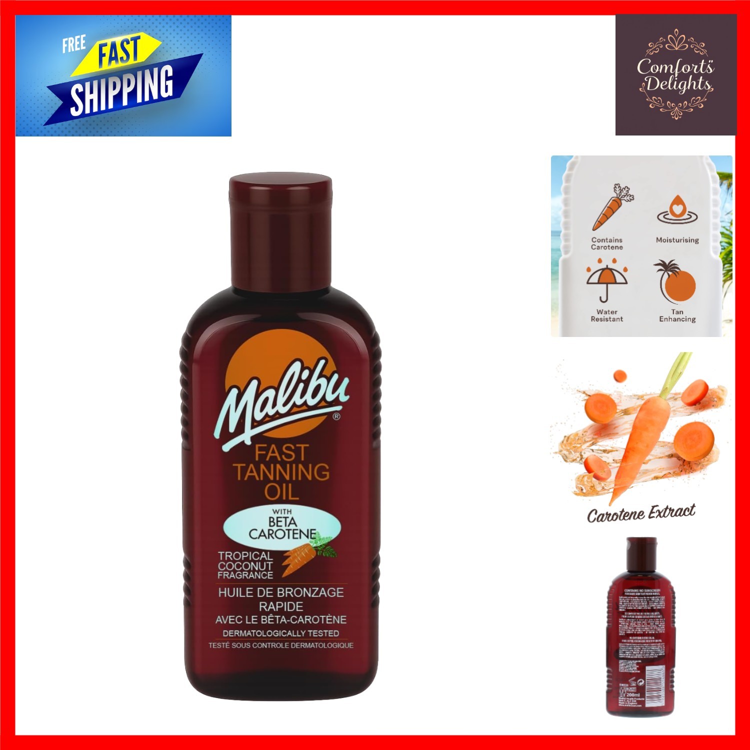 Malibu Sun Bronzing Fast Tanning Oil with Beta Carotene, Water Resistant, Tropical Coconut Fragrance, 200ml