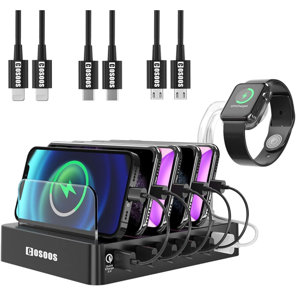Fastest Charging Station with Quick Charge 3.0, 6 Phone Charger Cables(3 Types), 6-Port USB Charger