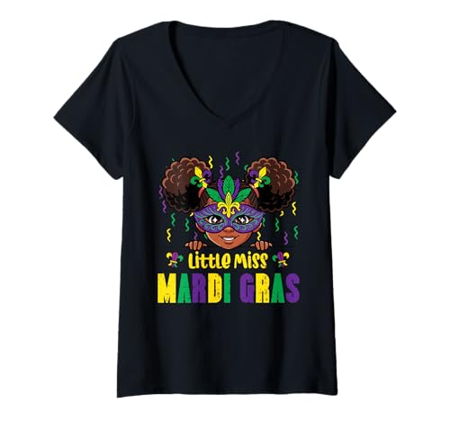 Women's Little Miss Mardi Gras Black Girl Fat Tuesday Girls Kids V-Neck T-Shirt