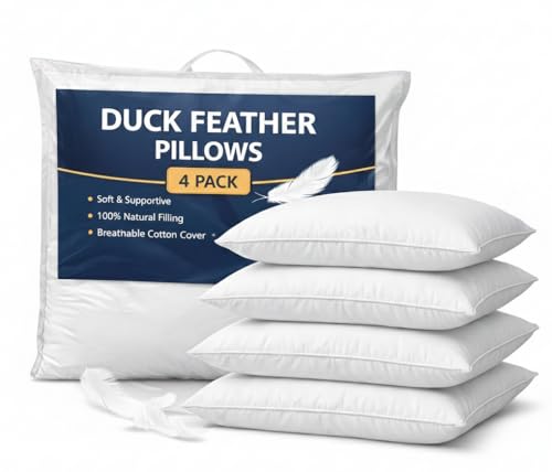 Duck Feather & Down Pillows (4 Pack) – Hotel Quality Bed Pillows for Sleeping, Soft & Breathable Pillow 1200GSM for Back, Side & Stomach Sleepers – Washable & Anti-Allergenic Comfort (50X75CM)