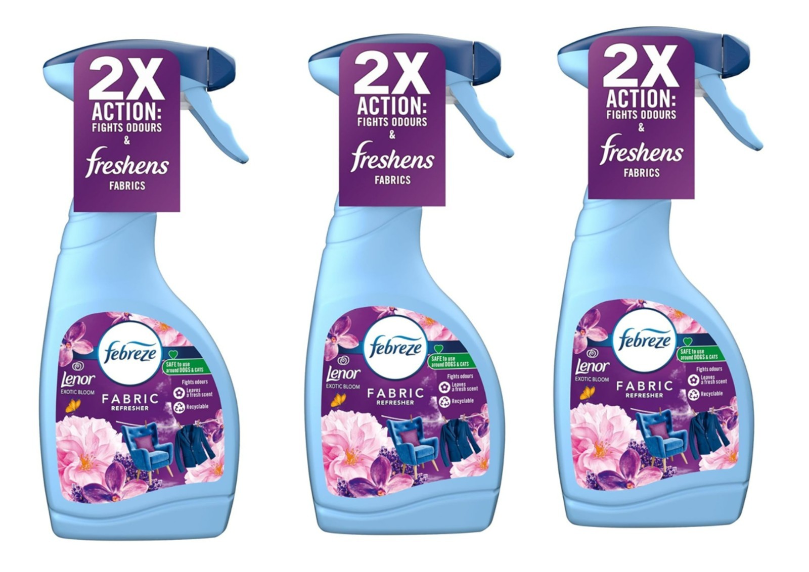 3X Febreze Fabric Freshener Spray Exotic Bloom 500ml Cleans Away Odours