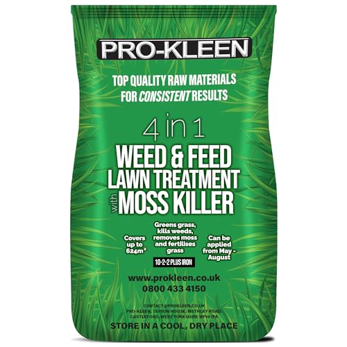Pro-Kleen 4 in 1 Weed and Feed Lawn Treatment with Moss Killer 20kg - Greens Grass, Kills Weeds & Moss & Fertilises Grass - Apply from May-August - Covers up to 624m2 - (20kg)