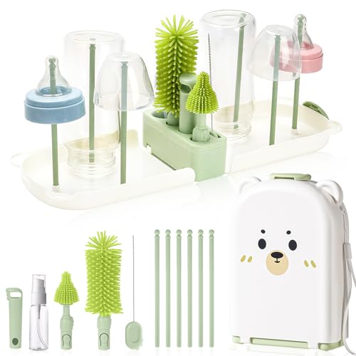 WeSweet Travel Bottle Brush Baby– Portable Baby Travel Essentials - Cleaning Brush/Nipple & Straw Cleaner/Soap Dispenser/Drying Rack Feeding Accessories