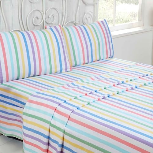 Rapport Home 100% Brushed Cotton Double Bed Sheet Set - Cosy Candy Stripe Flannelette Feel, Warm & Soft Bedding with Fitted, Flat Sheet & Pillowcases