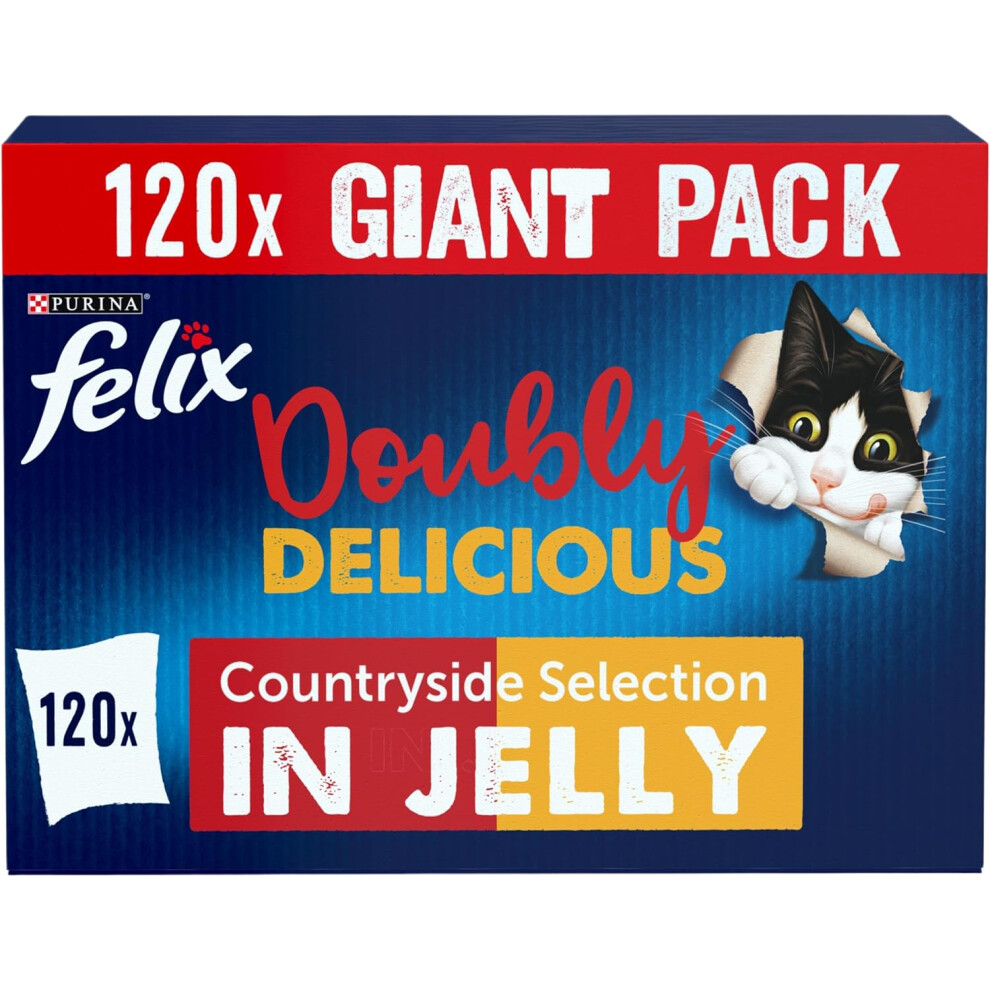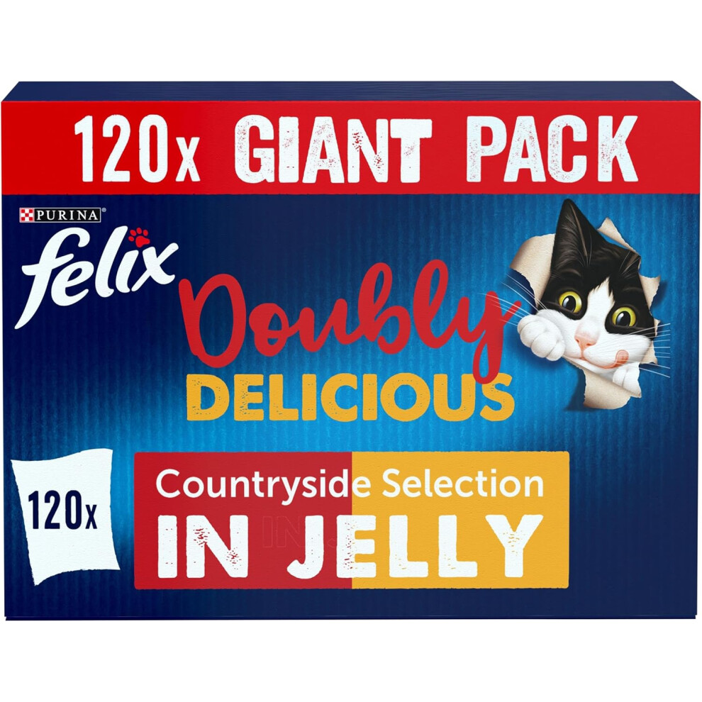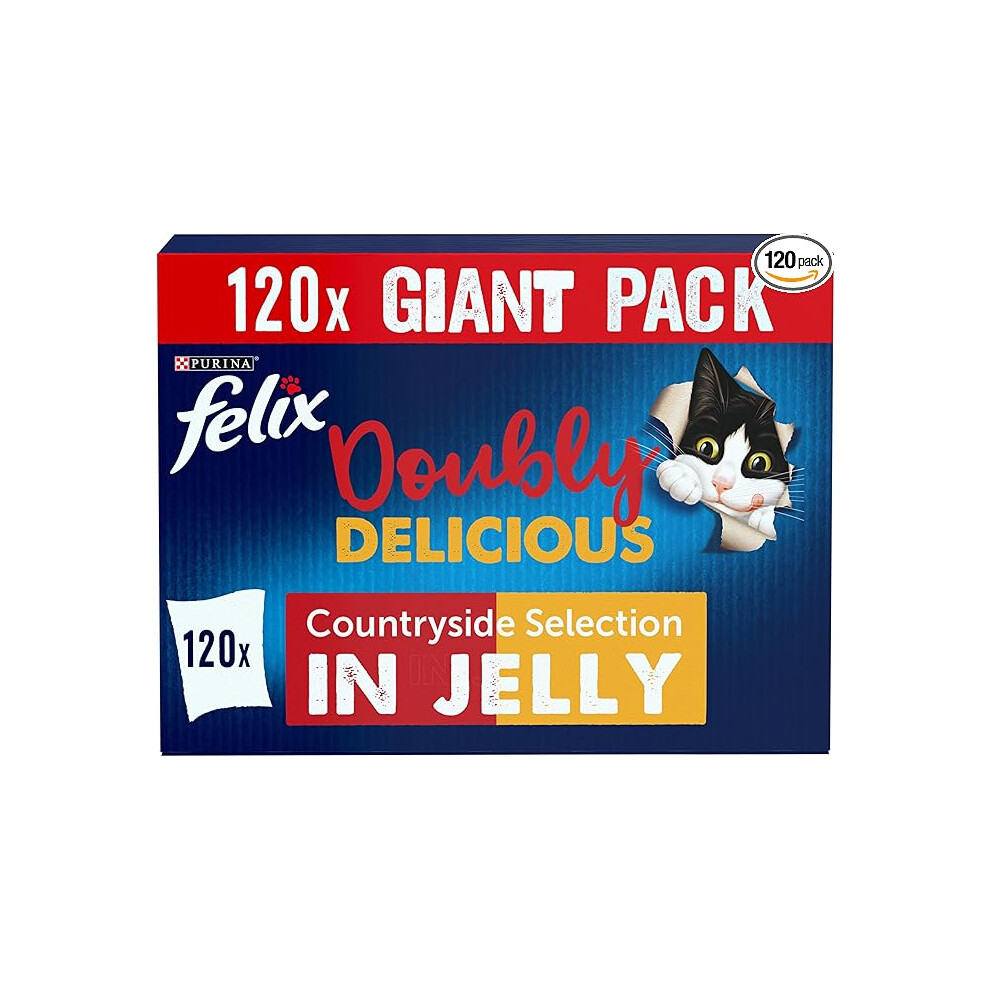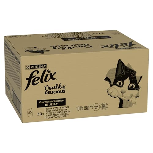 FELIX Doubly Delicious Adult Wet Cat Food Countryside Selection in Jelly Beef, Poultry, Chicken, Kidney, Lamb, Turkey, Liver 120 x 85g Pouches