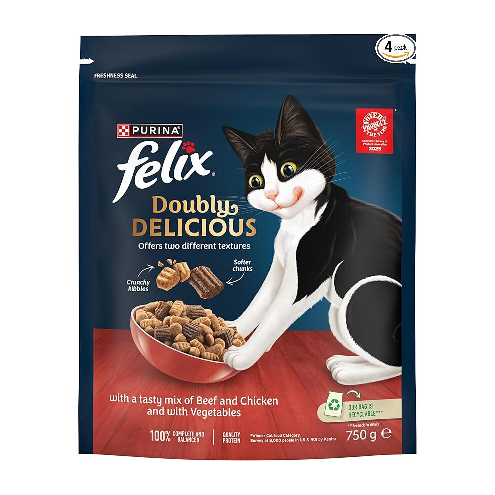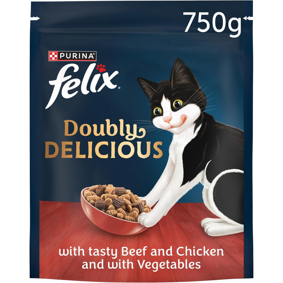 Felix Doubly Delicious Beef Chicken & Vegetables Dry Cat Food 750g (Pack of 4)