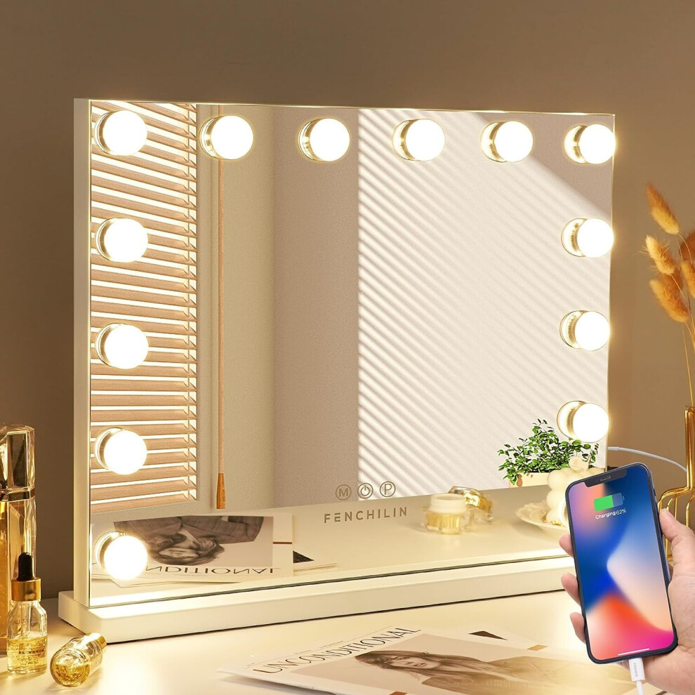 FENCHILIN Hollywood Vanity Cosmetic Mirror For Makeup with Lights, Type-C and USB Output Port, 15 Bulbs 3 Lighting Modes Tabletop and Wall Mounted