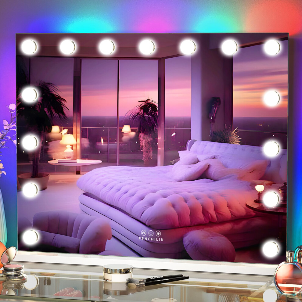 FENCHILIN Hollywood Mirror with RGB Backlit 15 LED Vanity Mirror with Lights 3 Lighting Modes Dynamic RGB Backlit Hollywood Vanity Makeup Mirror with