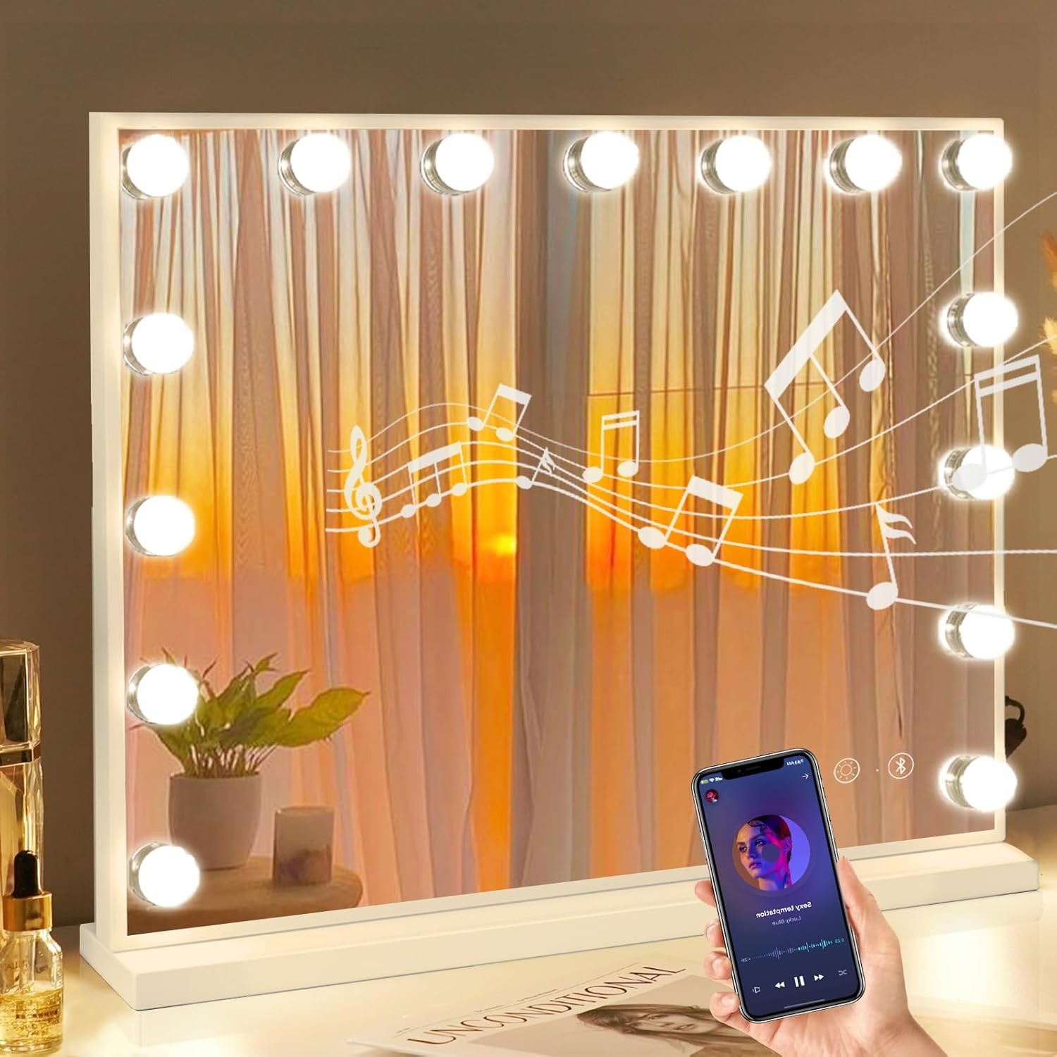 FENCHILIN Hollywood Vanity Mirror with Lights Large Makeup Mirror with 18 Dimmable LED Bulbs Lighted Vanity Mirror with Music Speaker 3 Color Modes Makeup Mirror with Lights and Magnification 80x60