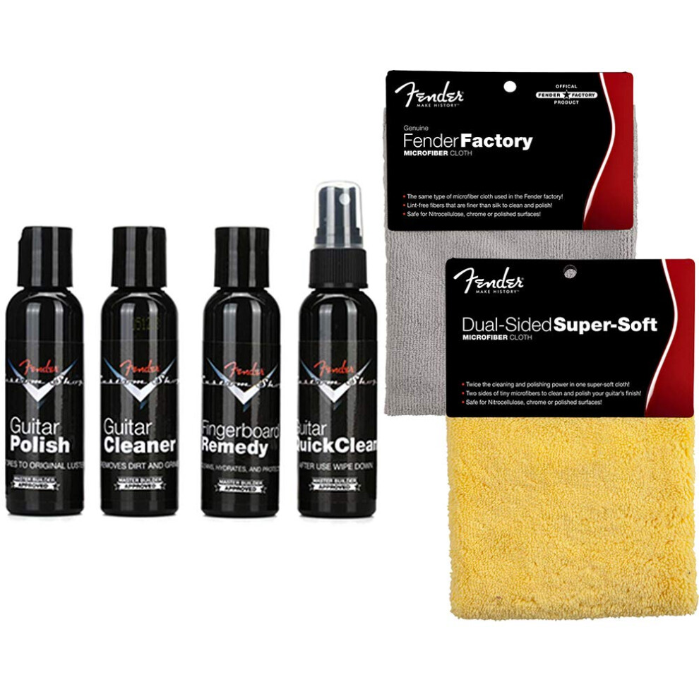 Fender Guitar Super Care Kit Bundle with Custom Shop Deluxe Guitar Care System 4 Pack Super-Soft Dual-Sided Microfiber Cloth and Fender Factory Micr