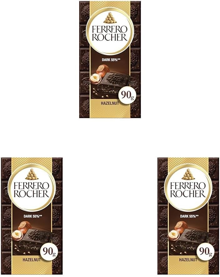 Ferrero Rocher Dark Chocolate and Hazelnut Bar, Chocolate Bars, 55 Percent Dark Chocolate with Crunchy Whole Hazelnut and Cocoa Filling, (90g) (Pack of 3)