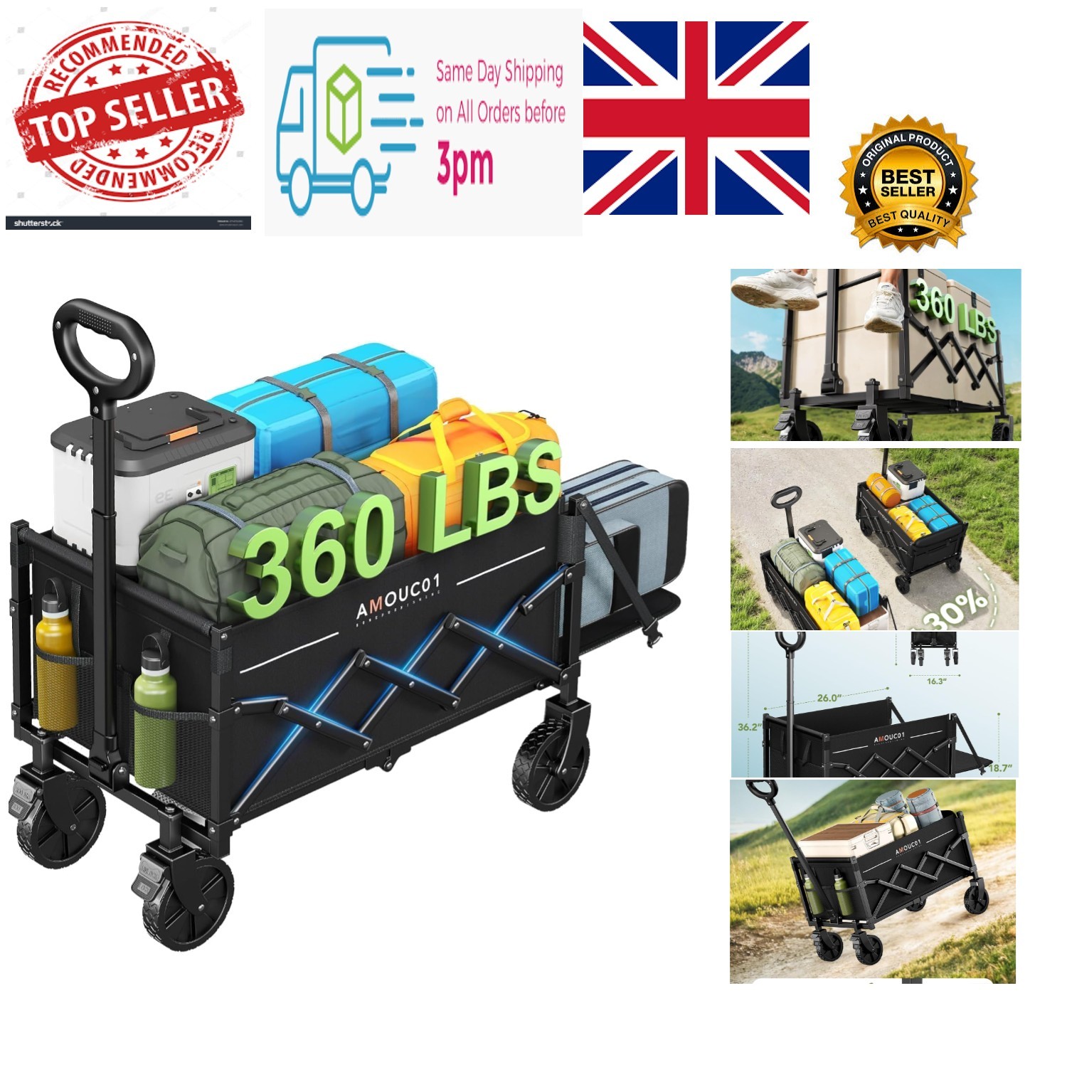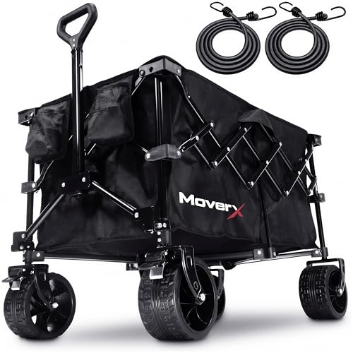 MoverX 300L Festival Trolley on Wheels, Folding Wagon, Portable Camping Cart, Collapsible Foldable Trolly for Beach Outdoor Garden Picnic Shopping Fishing, Wide Wheels, Adjustable Handle, Black