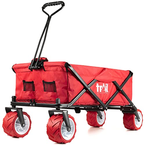 Trail Beach Trolley Cart Folding Camping Festival Wagon With Pull Along Handle, All Terrain Wheels, Drink Pockets, 60KG Capacity (Red)