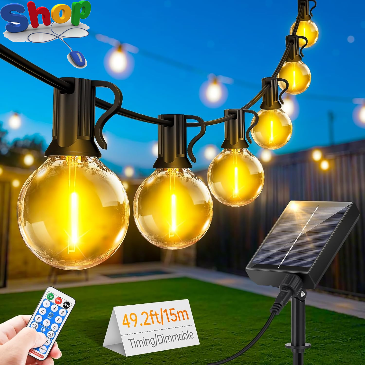 Solar String Lights Outdoor Garden - 15M 50FT Outdoor String Light Solar Powered with G40 LED Shatterproof Bulb 3 Remote Control Modes Solar Festoon Lights IP44Waterproof for Patio Party Wedding Decor