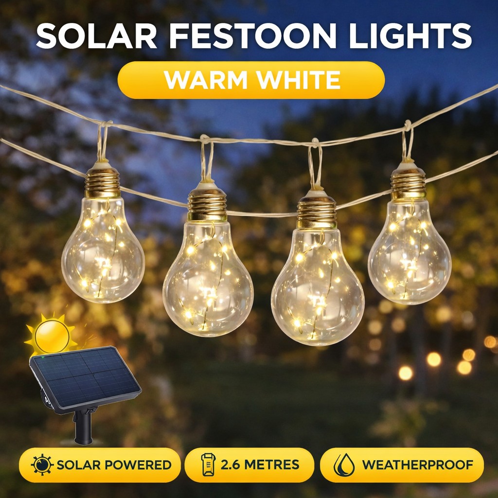 Solar Warm White Festoon Lights 2.6m 5 LED Outdoor Patio Garden Solar String