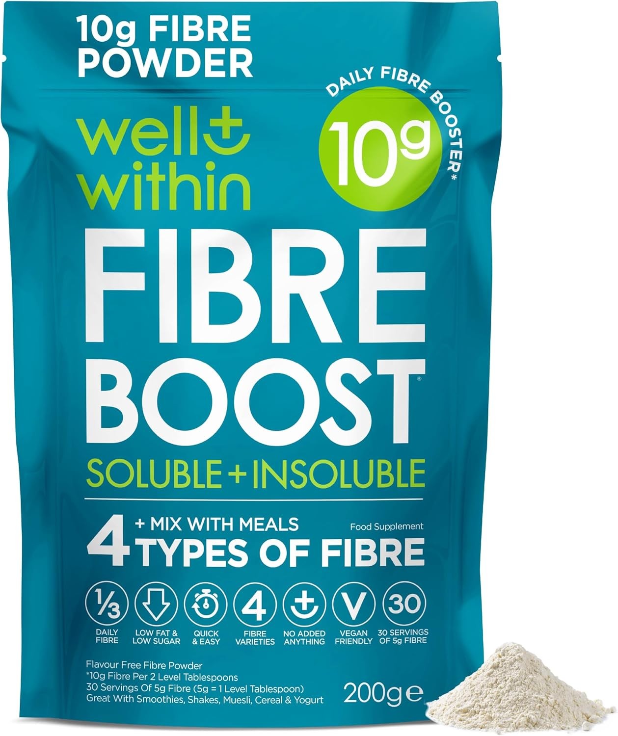 10g Fibre Supplement Powder, 1/3 NHS Daily Intake, 4in1 Insoluble & Soluble Fibre Powder, 4 Types of Fiber (200g Bag, 2 Servings = 10g Fiber) Well Within. for Men, Women & Kids