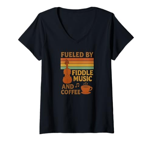 Womens Fueled by Fiddle Music and Coffee Bluegrass & Coffee Lover V-Neck T-Shirt