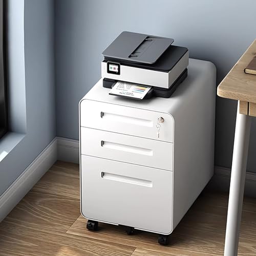 TJKK Large Capacity File Cabinet with Lock, Filing Cabinet with 3 Draws, Under Desk Storage Filing Cabinets for Home Office, Printer Stand with Universal Wheel (One Size,White)