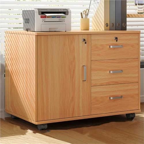 TJKK Large Capacity File Cabinet with Lock, Filing Cabinet with 3 Draws, Under Desk Storage Filing Cabinets for Home Office, Printer Stand with Universal Wheel (One Size,Natural)