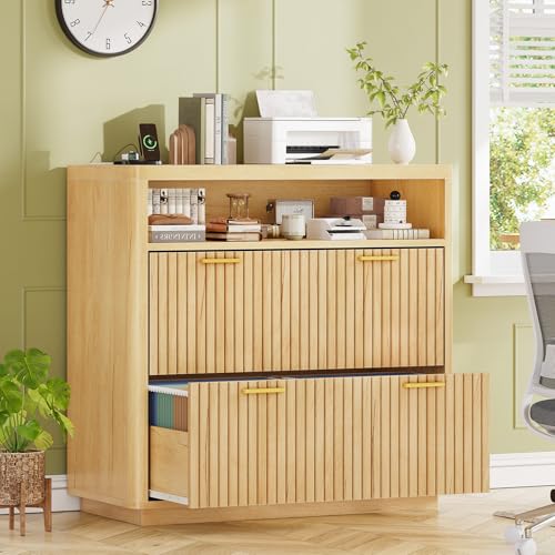 XJBTBA 2 Drawer File Cabinet, 31.5" Farmhouse Filing Cabinets for Home Office Fits Letter/Legal/A4 Size, Fluted File Cabinet with Power Strip, Printer Stand with Storage, Natural Oak