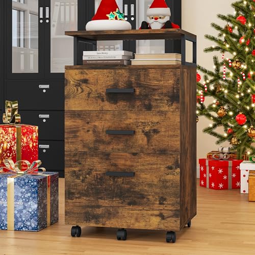 YITAHOME Mobile File Cabinet, 3-Drawer Filing Cabinets for Home & Office, Storage Cabinet with Drawers 5 Wheels Open Compartment, Metal Frame, Office Storage Rolling Office Cabinet (Rustic Brown)