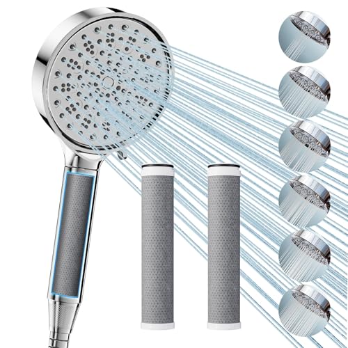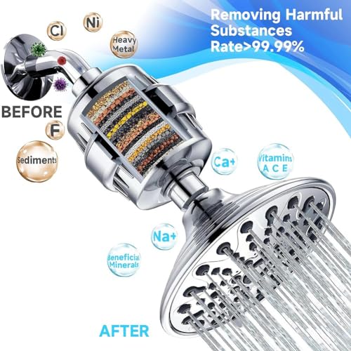 Hard Water Filter Shower Head with 6 Spray Modes, High Pressure Water Saving Shower Head with 20 Layers Filtration, Power Shower Heads with Showerhead Filter for Residual Chlorine Remove, Chrome