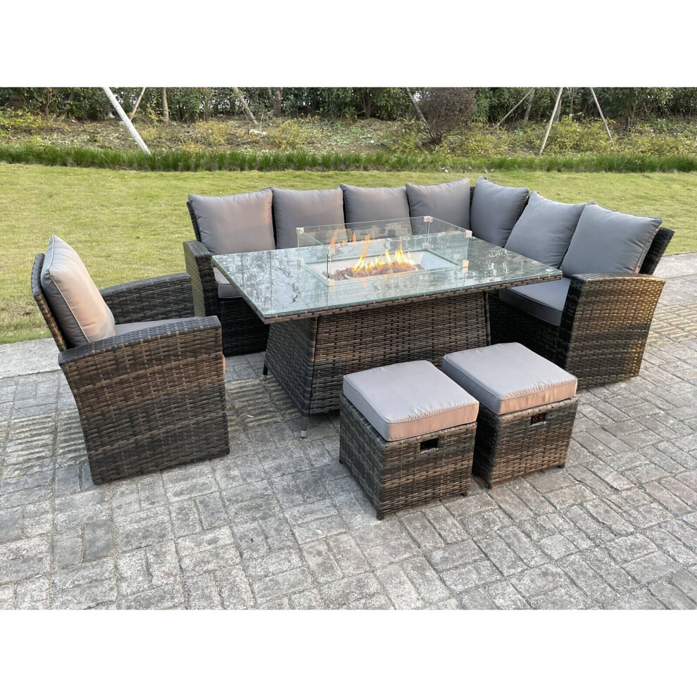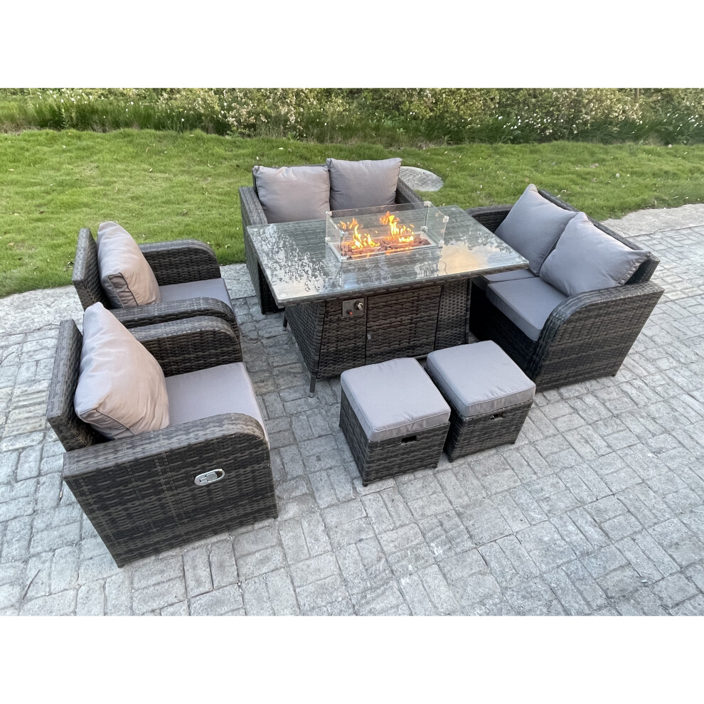 Fimous Outdoor Rattan Garden Furniture Gas Fire Pit Dining Table Sets Gas Big Footstool 7 Seater