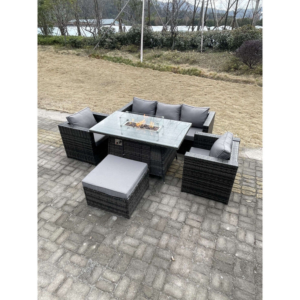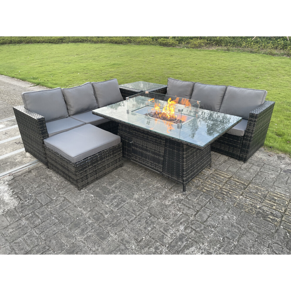 Fimous Rattan Garden Furniture Gas Fire Pit 6 Seater Plus Rectangular Table