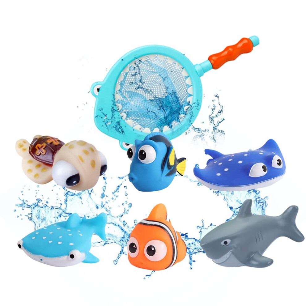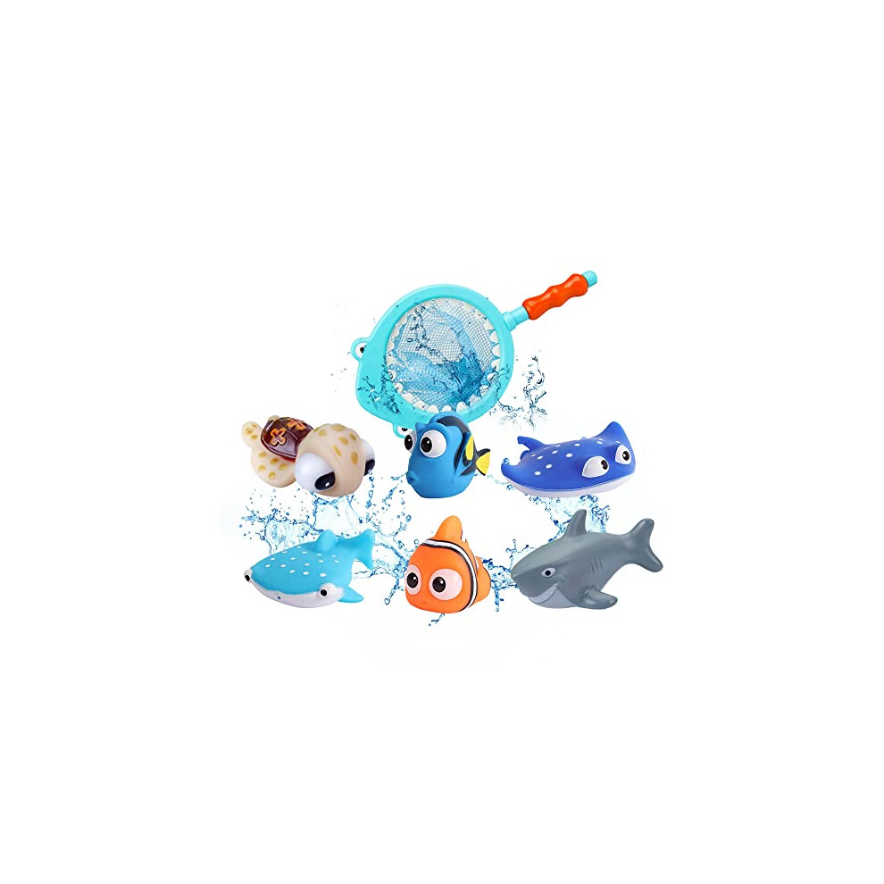 Finding Nemo Toys, 7Pcs Bath Toys for Baby Shower Toddler Cute Floating Sea Animals with Fishing Net Bath Water Squirt Fish Toy Gift for Age 3+ Boy Girl Bathtub Swimming Pool